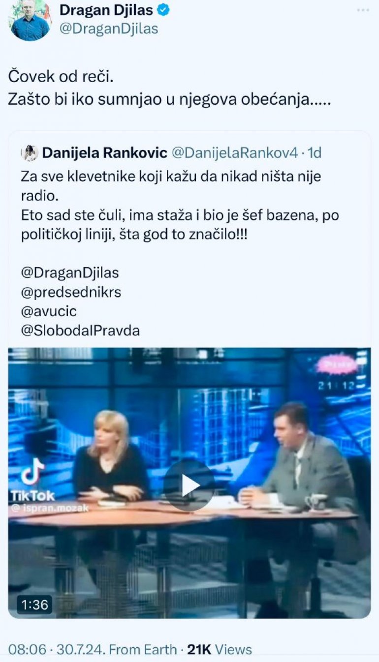 LLIDER Stranke slobode i pravde Dragan Đilas jutros je na društvenoj mreži "Iks" podelio deo svog TV duela iz 2005. godine sa Aleksandrom Vučićem na televiziji Pink, u svom lošem pokušaju da napadne predsednika Srbije.