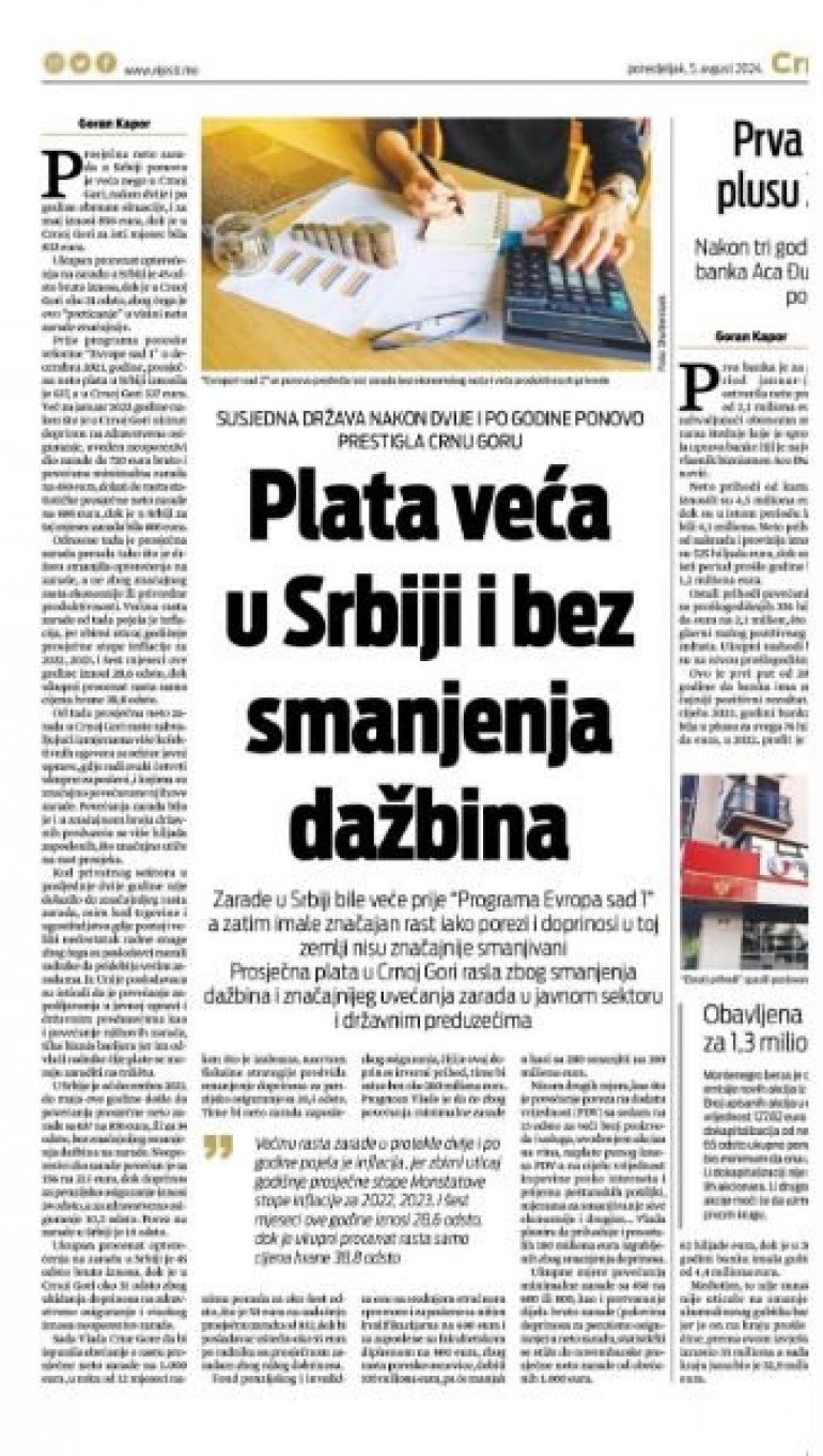 - Plate ponovo veće u Srbiji, susedna država nakon dve i po godine ponovo prestigla Crnu Goru - stoji u naslovu.