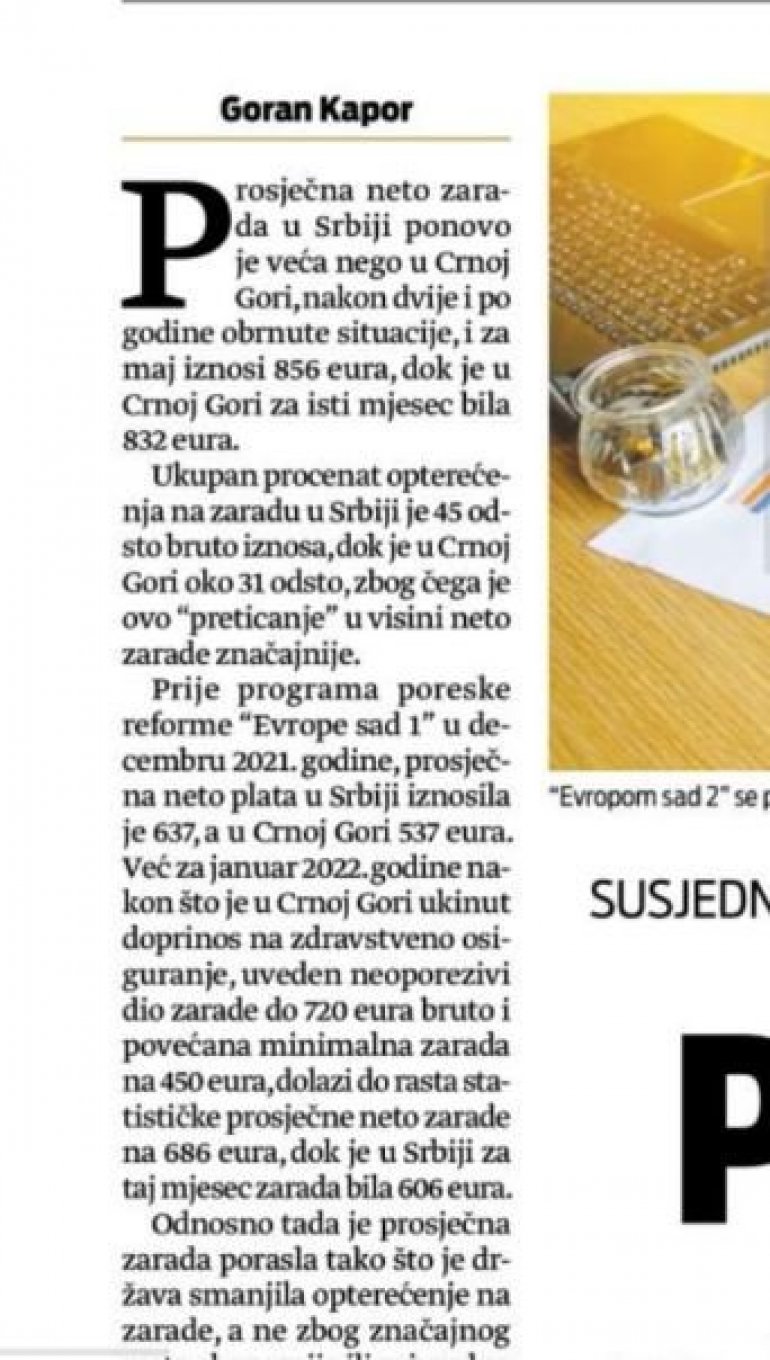 - Prosečna neto zarada u Srbiji ponovo je veća nego u Crnoj Gori, nakon dve i po godine obrnute situacije, i za maj iznosi 865 evra, dok je u Crnoj Gori za isti mesec bila 832 evra. Ukupan procenat opterećenja na zaradu u Srbiji je 45 odsto bruto iznosa, dok je u Crnoj Gori oko 30 odsto - piše Goran Kapor.