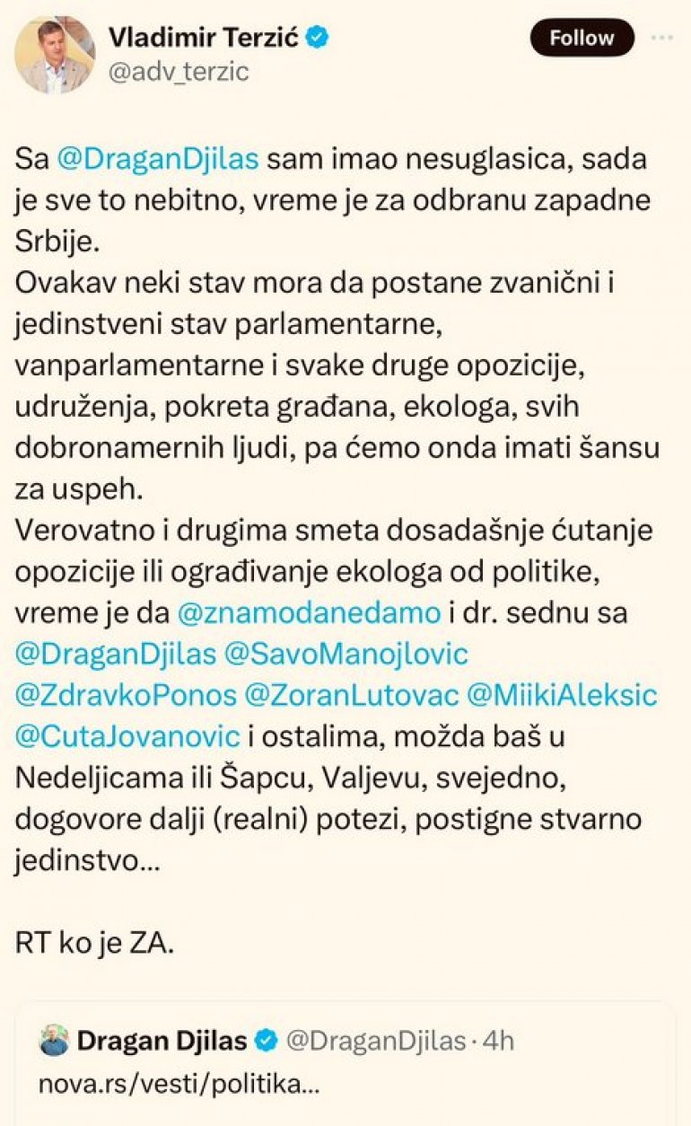 ADVOKAT lažnih ekologa Vladimir Terzić na društvenoj mreži Iks poziva ljude da u što većem broju podrže Dragana Đilasa.