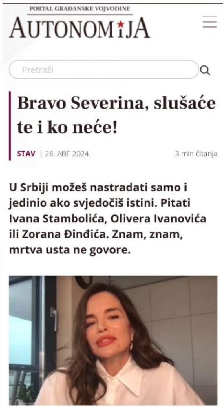 "Severina je kriva što kaže povijesnu istinu - da je u Srebrenici bio genocid, što tvrdi da je većina medija u Srbiji režimska i što svjedoči tim istinama. I zato joj je otežan ulazak u Nacionalni Park Srbija. Samo mogu reći, Seve bravo, slušaće te i ko neće! A spisak ljudi kojima je onemogućen ulazak u Srbiju je zapravo popis živih pravednika!