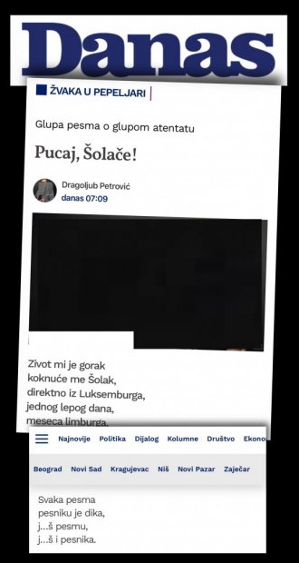 Petrović je u svojoj imbecilnoj pesmi na kraju i opsovao Vučića, ali najskandalozniji je naslov “Pucaj, Šolače!” koji, ma koliko imbecilna pesma bila, odražava mračne želje Šolakove medijske mašinerije, koje se svode na prizor mrtvog Vučića.