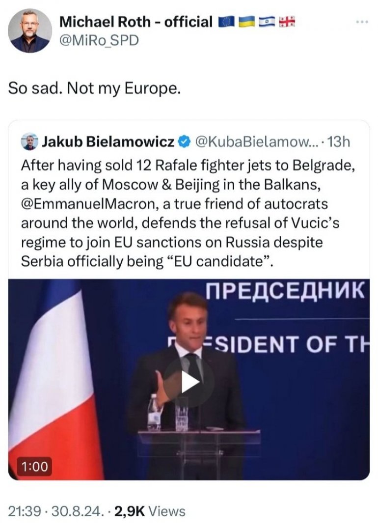 Nemačkom evroparlamentarcu Mihaelu Rotu, koji se “proslavio” podrškom srpskoj opoziciji u nameri da nasiljem sruši Aleksandra Vučića, zasmetalo je to što je Francuska prodala Srbiji 12 aviona “rafal” i što predsednik te zemlje Emanuel Makron poštuje suverenitet naše države i odluku da ne uvodimo sankcije Rusiji.