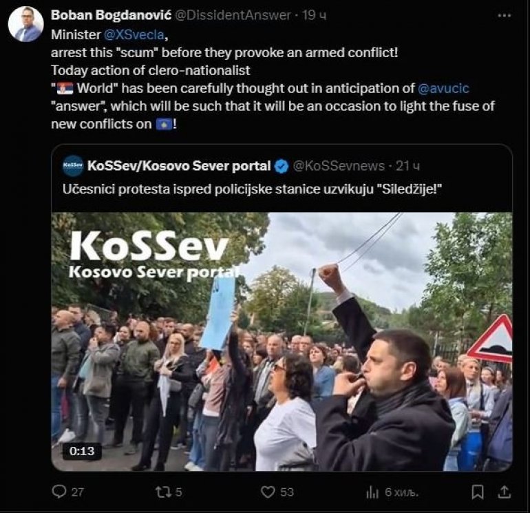 - Ministre Svečlja, hapsite ovaj "ološ" pre nego što izazovu oružani sukob! Današnja akcija kleronacionalista "srpski svet“ je pažljivo osmišljen u iščekivanju "odgovora" Aleksandra Vučića, koji će biti takav da će biti povod da se upali fitilj novih sukoba na Kosovu! - bez imalo srama napisao je kurtijevac i simpatizer srpske opozicije.