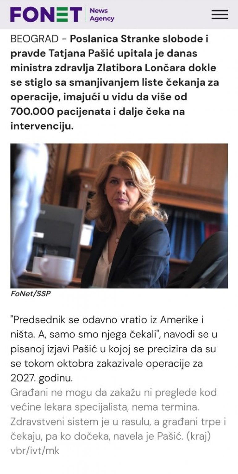 NARODNA poslanica Đilasove Stranke slobode i pravde (SSP) Tatjane Pašić izjavila je danas da još uvek 700.000 ljudi čeka operaciju, iako je aktuelna vlast najavila da će problem lista čekanja u zdravstvenim ustanovama biti rešen.
