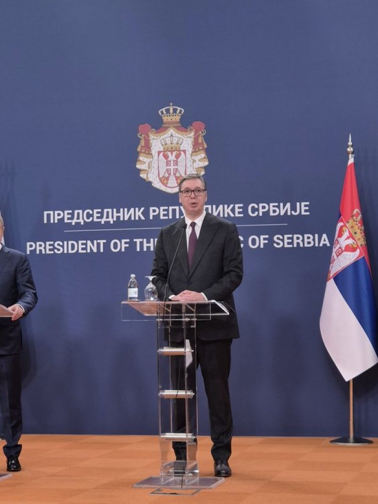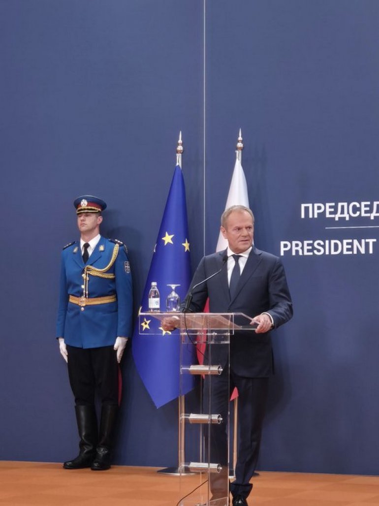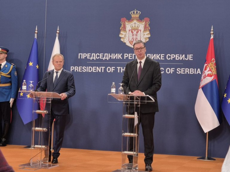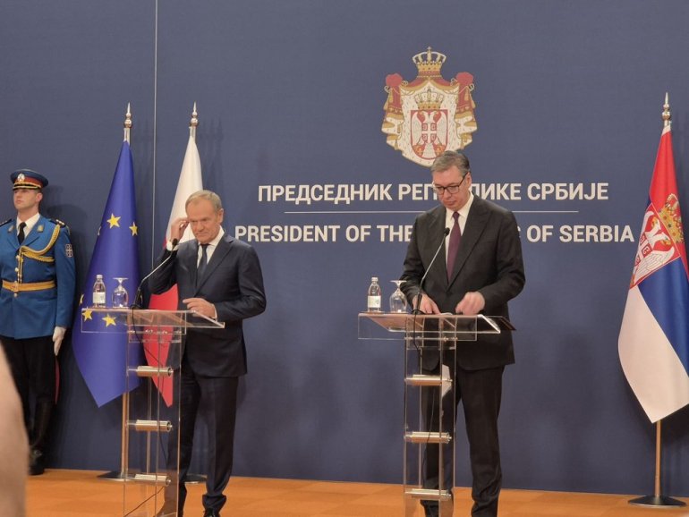 - Sinoć i jutros sam imao čast da na ozbiljan i odgovoran način razgovaram sa Donaldom Tuskom, jednim od najvažnijih evropskih lidera, počastvovan, jer je posetio Beograd. Želim da se posebno zahvalim Tusku, jer je i kao predsednik Evropskog saveta dolazio u Beograd i još tada, 2018. godine, doneo izuzetno ohrabrujuće poruke za Srbiju. Želeo je da čuje stavove Srbije i da sasluša poziciju naše zemlje - rekao je predsednik.