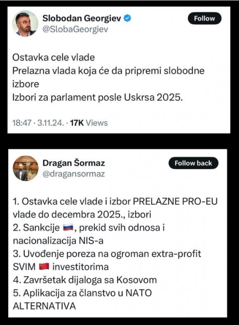 - Ostavka cele vlade. Prelazna vlada koja će da pripremi slobodne izbore. Izbori za parlament posle Uskrsa 2025. - napisao je Slobodan Georgiev na mreži H.