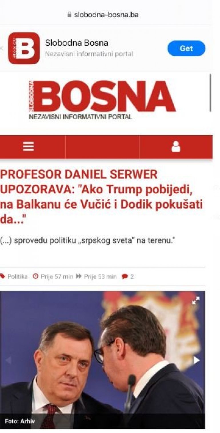 Tako je Slobodna Bosna objavila tekst u kome "Server upozorava" da ako na izborima u Americi pobedi Donald Tramp, "na Balkanu će Vučić i Dodik pokušati da spovedu politiku srpskog sveta na terenu".