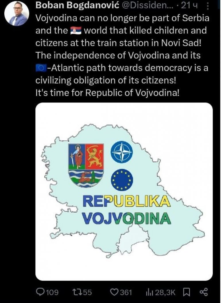 Bogdanović sada poziva na otcepljenje Vojvodine, zbog tragedije u Novom Sadu.