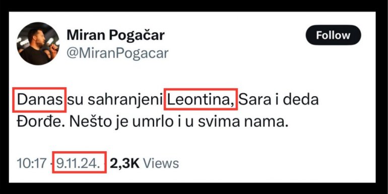 - Danas su sahranjeni Leontina, Sara i deda Đorđe. Nešto je umrlo i u svima nama. - navodi se u današnjoj objavi.