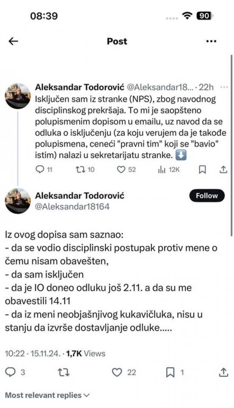 DOJUČERAŠNjI predsednik Nadzornog odbora i sekretar svih resornih odbora Aleksićeve stranke, Aleksandar Todorović, na mreži Iks optužio je Aleksića koji ga je izbacio iz stranke obaveštavajući ga o tome u "polupismenom mejlu, kukavički".