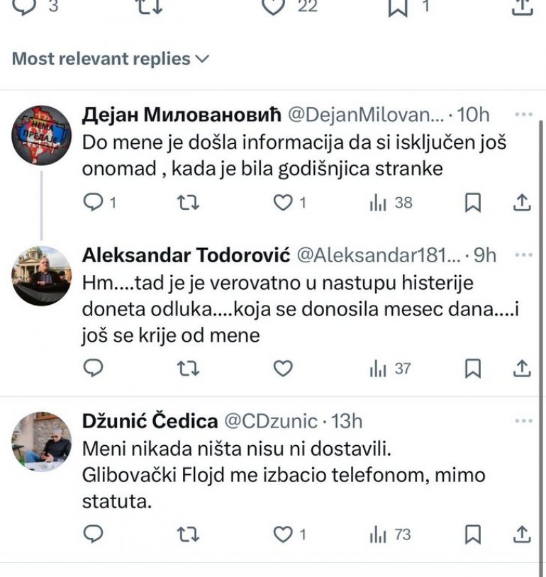 U razgovoru na mreži Iks uključio se još jedan izbačeni član stranke koji je Aleksića nazvao "Glibovački Flojd" i rekao da ga je Aleksić isključio lično iz stranke telefonskim pozivom mimo statuta.
