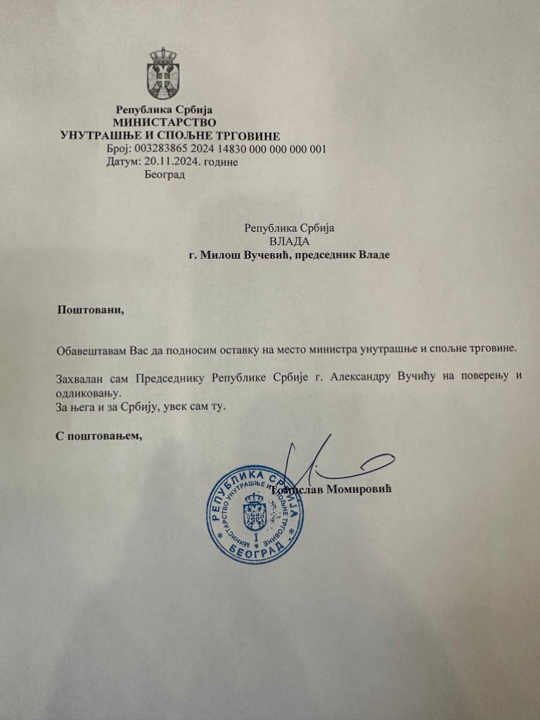 Momirović je ostavku podneo predsedniku Vlade Srbije Milošu Vučeviću. U ostavci je takođe naveo i sledeće: