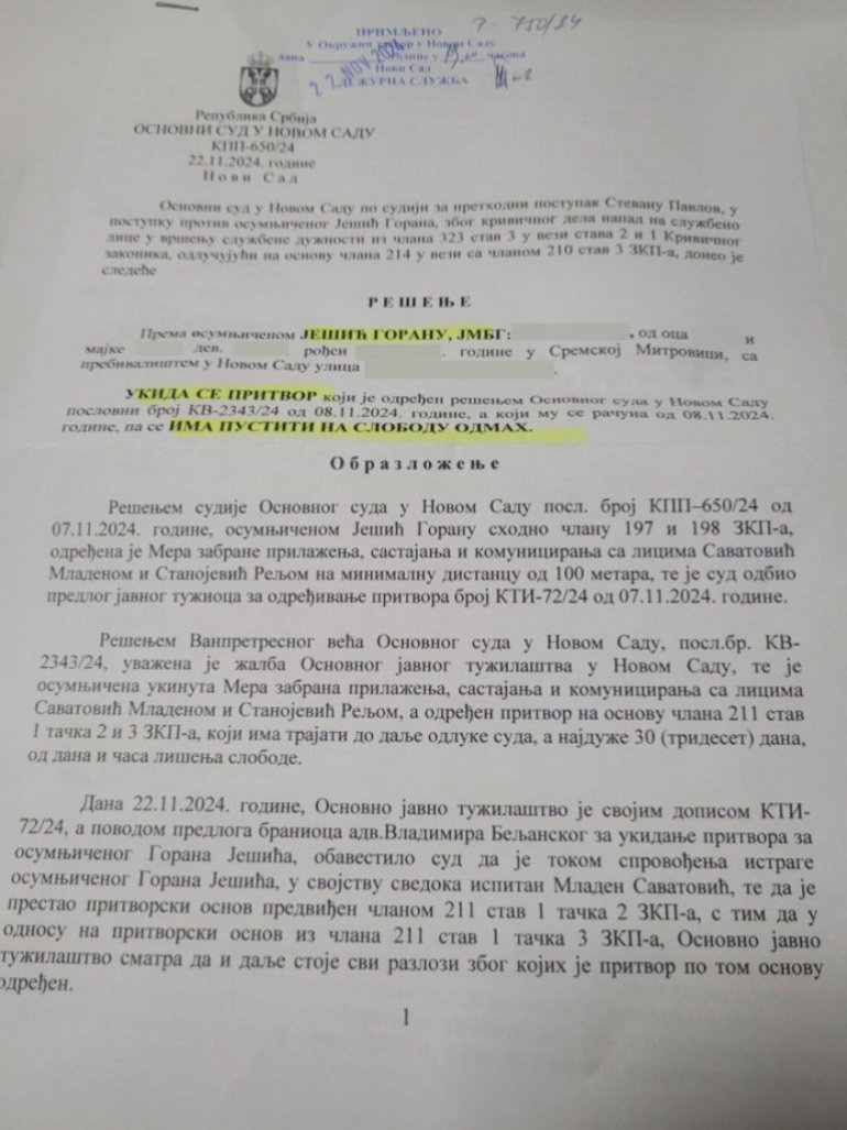 - Prema osumnjičenom Ješić, Goranu, UKIDA SE PRITVOR koji je određen rešenjem Osnovnog suda u Novom Sadu od 8.11.2024. godine, pa se IMA PUSTITI NA SLOBODU ODMAH - piše u rešenju Suda.