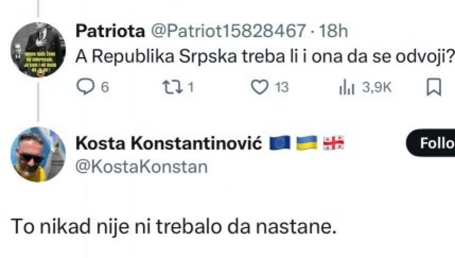 OPOZICIONAR Dragana Đilasa Kosta Konstantinović na društvenoj mreži ''Iks'' napisao je da Vojvodinu treba otcepiti, a da Republika Srpska nikada nije trebala da nastane!