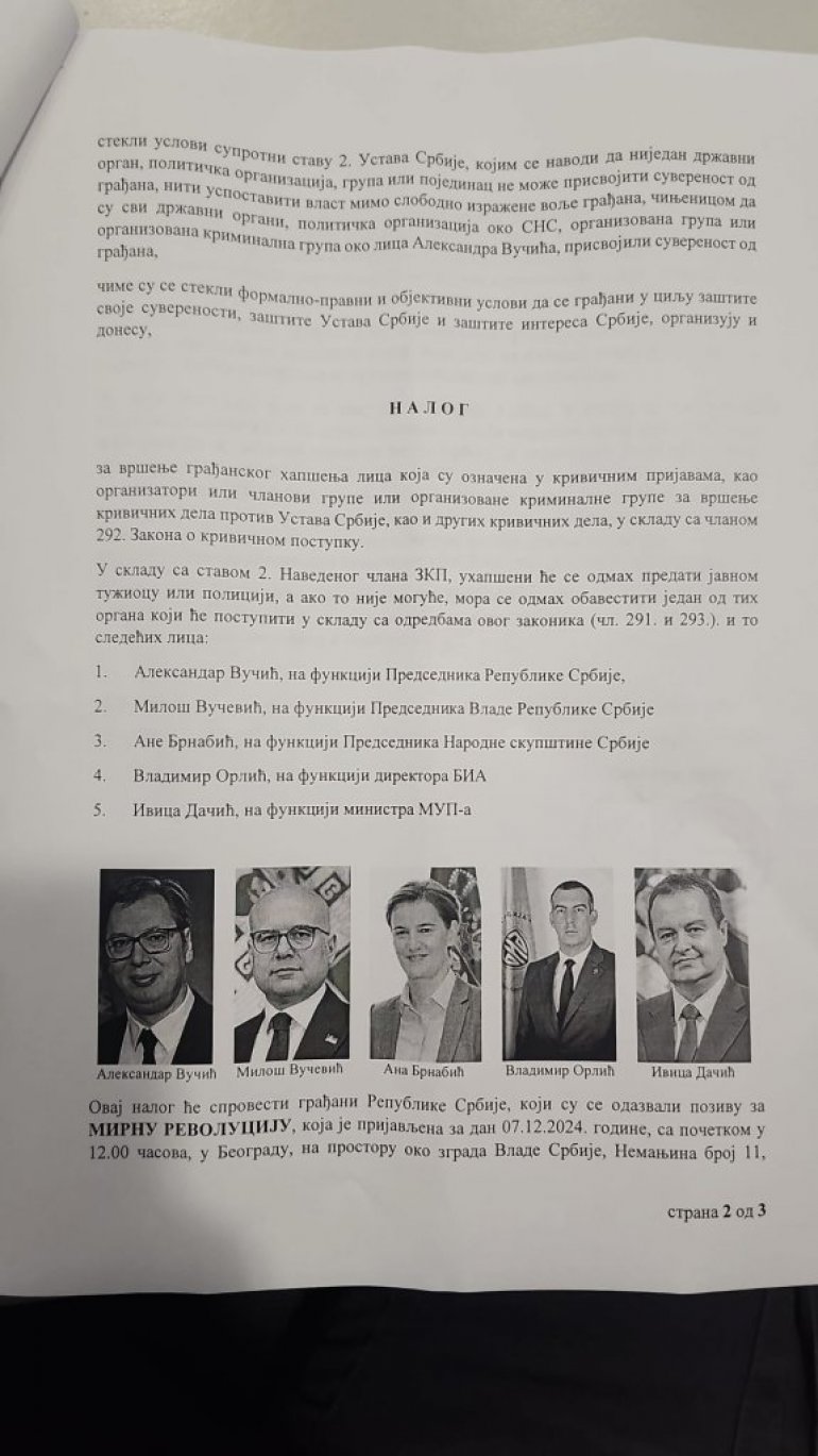 U lecima, koje potpisuje tzv. "Cerski pokret", građani se pozivaju da izvrše "nalog" za "građansko hapšenje", a za koje nisu ispunjeni uslovi propisani Zakonikom o krivičnom postupku (ZKP).