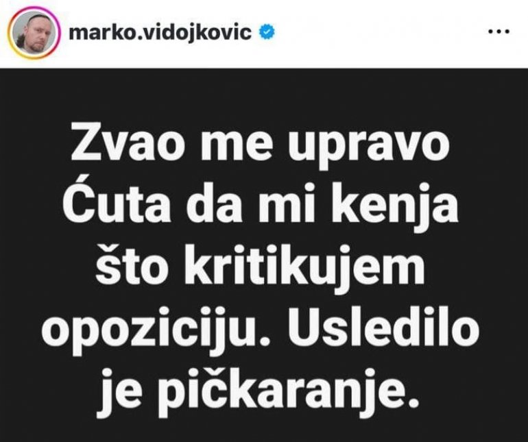 - Zvao me upravo Ćuta da mi ke*a što kritikujem opoziciju. Usledilo je pi**aranje "- istao je Vidojković.