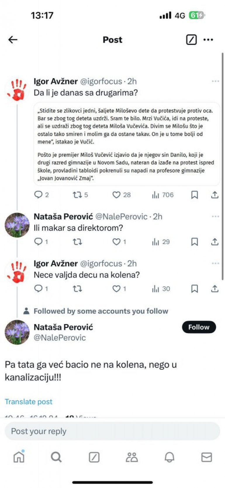 - Ili makar sa direktorom, dodao je drugi korisnik na ovoj društvenoj mreži pod imenom Nataša Perović, na šta je Avžner odgovorio: - Neće valjda decu na kolena?