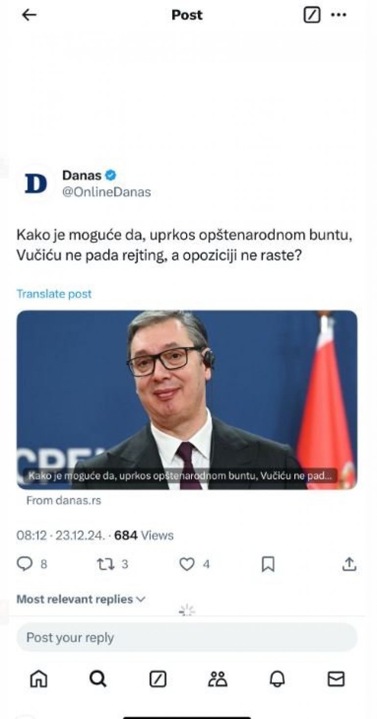 - Kako je moguće da, uprkos opštenarodnom buntu, Vučiću ne pada rejting, a opoziciji ne raste - zapitali su se u tekstu koji su objavili.