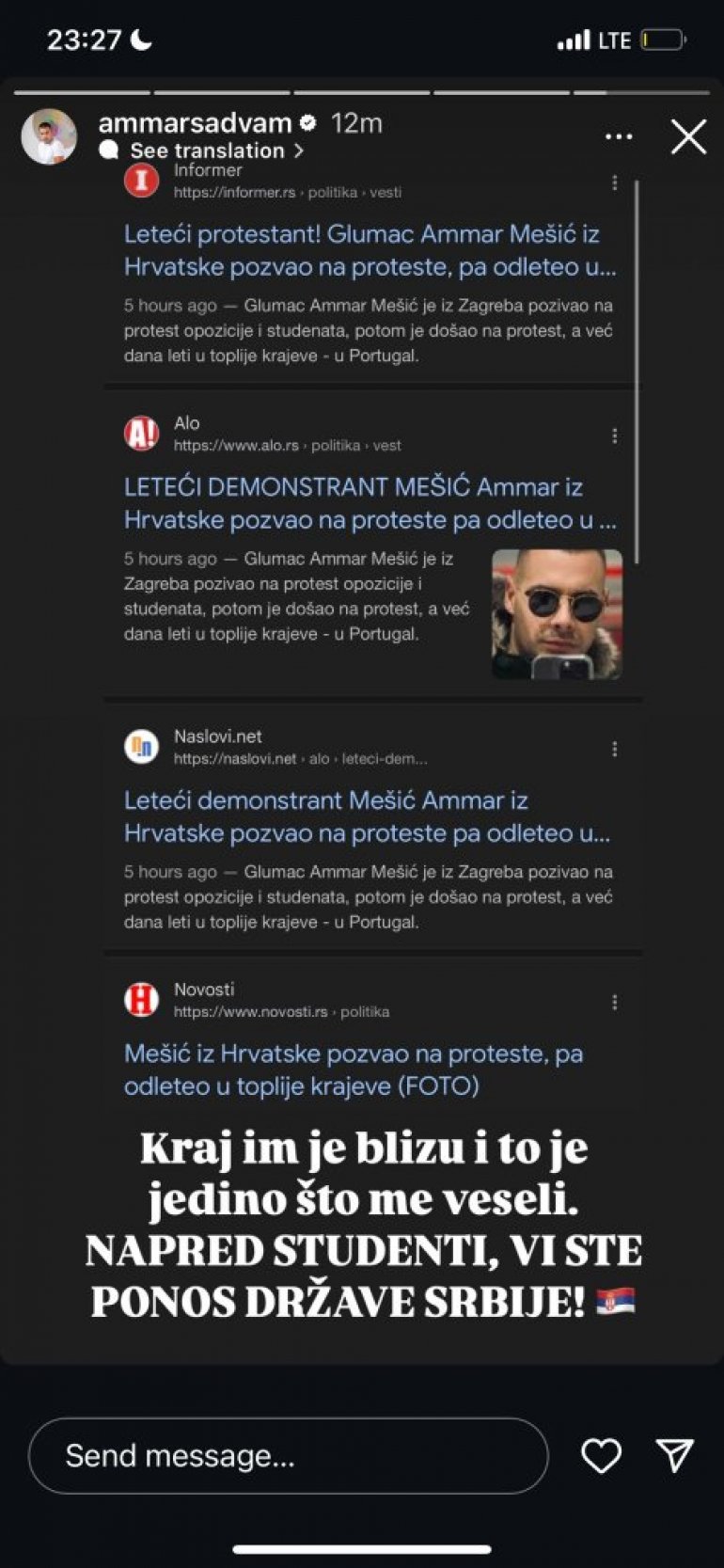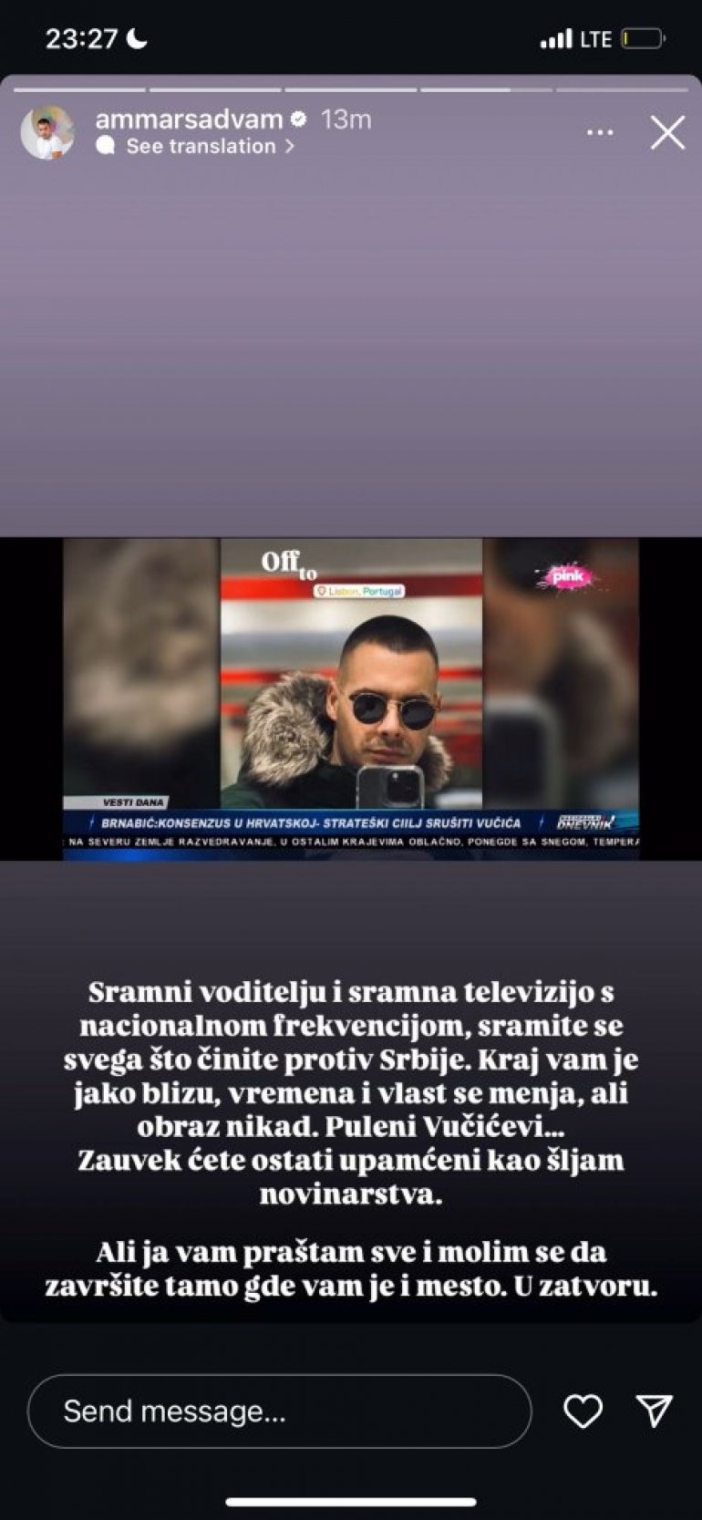KRAJ VAM JE BLIZU: Ammar Mešić preko Instagrama uputio pretnju srpskim novinarima (FOTO)