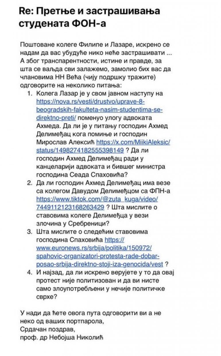 U nastavku možete videti pitanja koja je profesor Nikolić postavio studentima, zbog, kako je i sam naglasio, transparentnosti, istine i pravde...