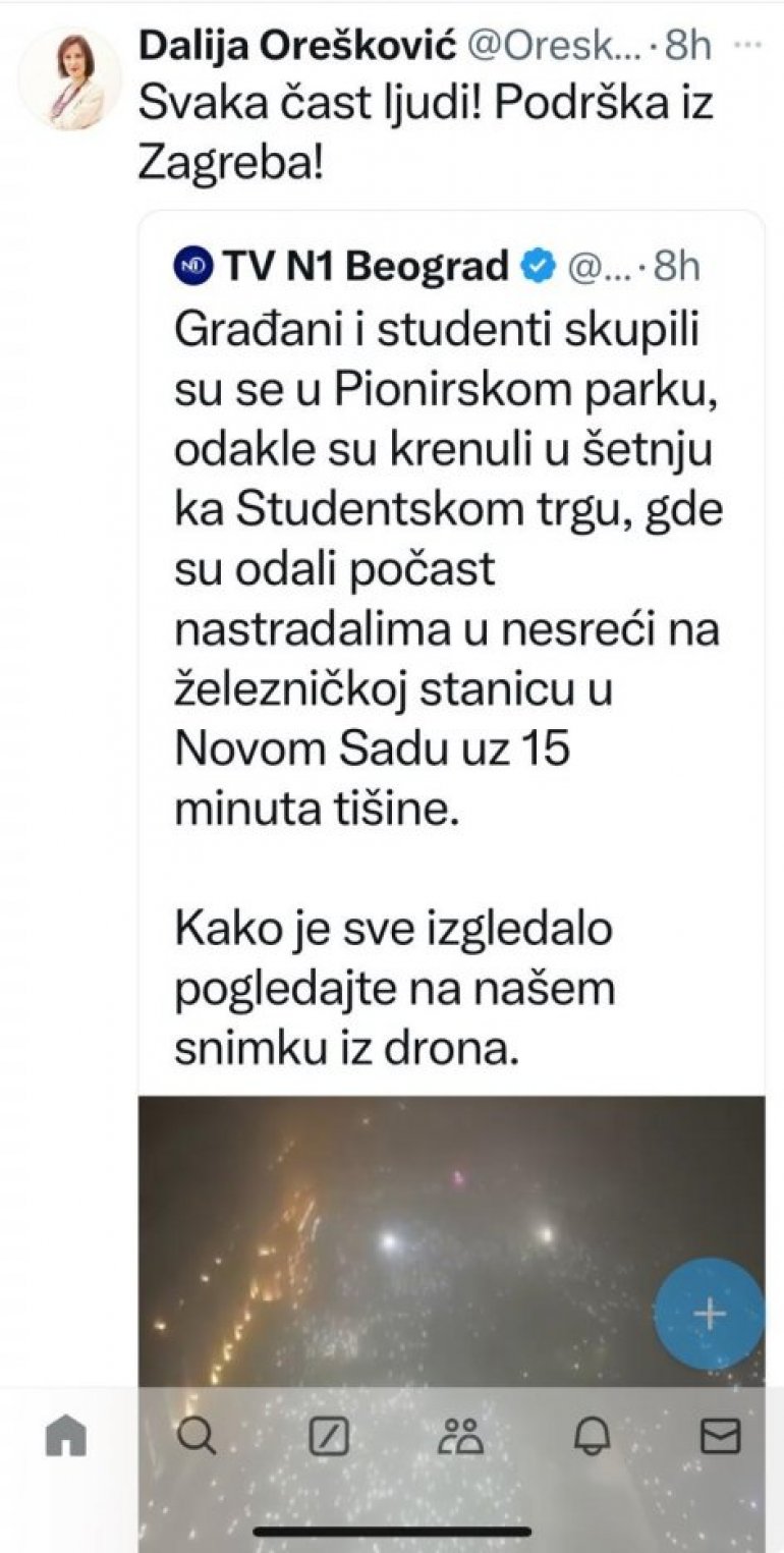 DALIJA Orešković zastupnica je u Hrvatskom saboru dala je podršku političkim protestima koje organizuje opozicija i studentski aktivisti u Srbiji.