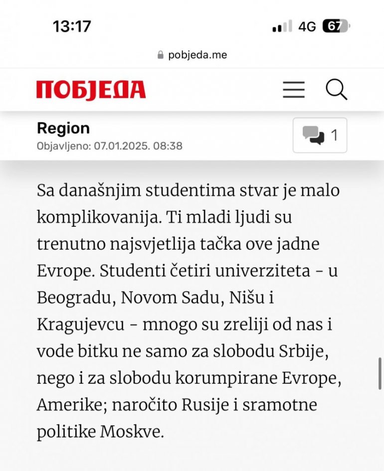 - Sa današnjim studentima stvar je malo komplikovanija. Ti mladi ljudi su trenutno najsvjetlija tačka ove jadne Evrope. Studenti četiri univerziteta - u Beogradu, Novom Sadu, Nišu i Kragujevcu - mnogo su zreliji od nas i vode bitku ne samo za slobodu Srbije, nego i za slobodu korumpirane Evrope, Amerike; naročito Rusije i sramotne politike Moskve- izjavio je Ješić za ''Pobjedu''.