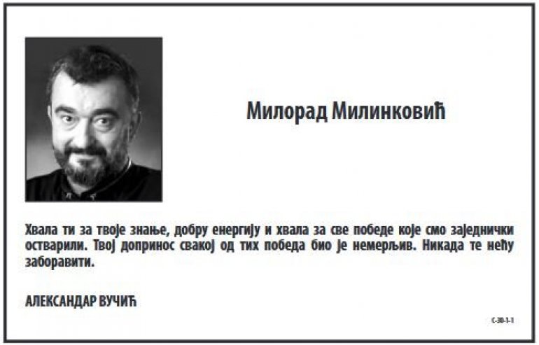 - Hvala ti za tvoje znanje, dobru energiju i hvala za sve pobede koje smo zajednički ostvarili. Tvoj doprinos svakoj od tih pobeda bio je nemerljiv. Nikada te neću zaboraviti. Aleksandar Vučić - navodi se u čitulji predsednika, objavljenoj u Večernjim novostima.