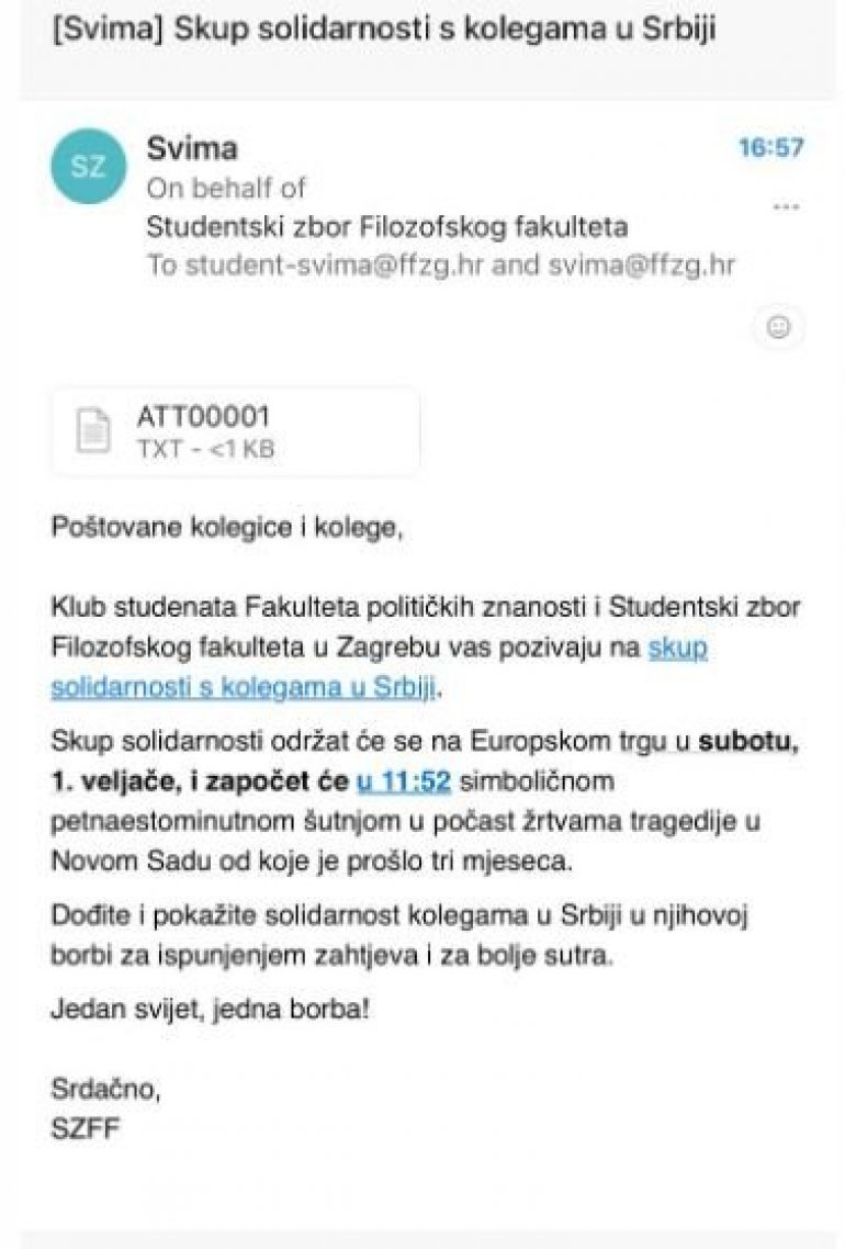 Naime, sa Fakulteta političkih nauka i Filozofskog fakulteta u Zagrebu pozivaju na "skup solidarnosti s kolegama u Srbiji".