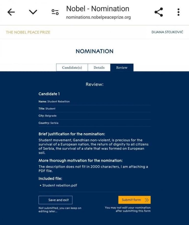 - Upravo je od Nobelovog komitera stigla potvrda da je prihvaćena kandidatura za Nobelovu nagradu za mir,kojom smo gospođa Dijana Stojković,advokat i ja kandidovali srpske studente - napisao je on.