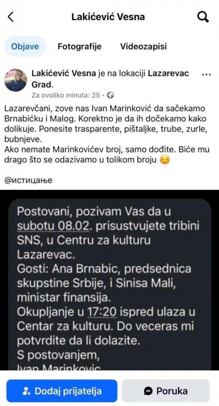 Naime, Vesna Lakićević pozivana na društvenim mrežama građane da prave haos i napadnu ministra finansija Sinišu Malog i predsednicu Skupštine Srbije Anu Brnabić.