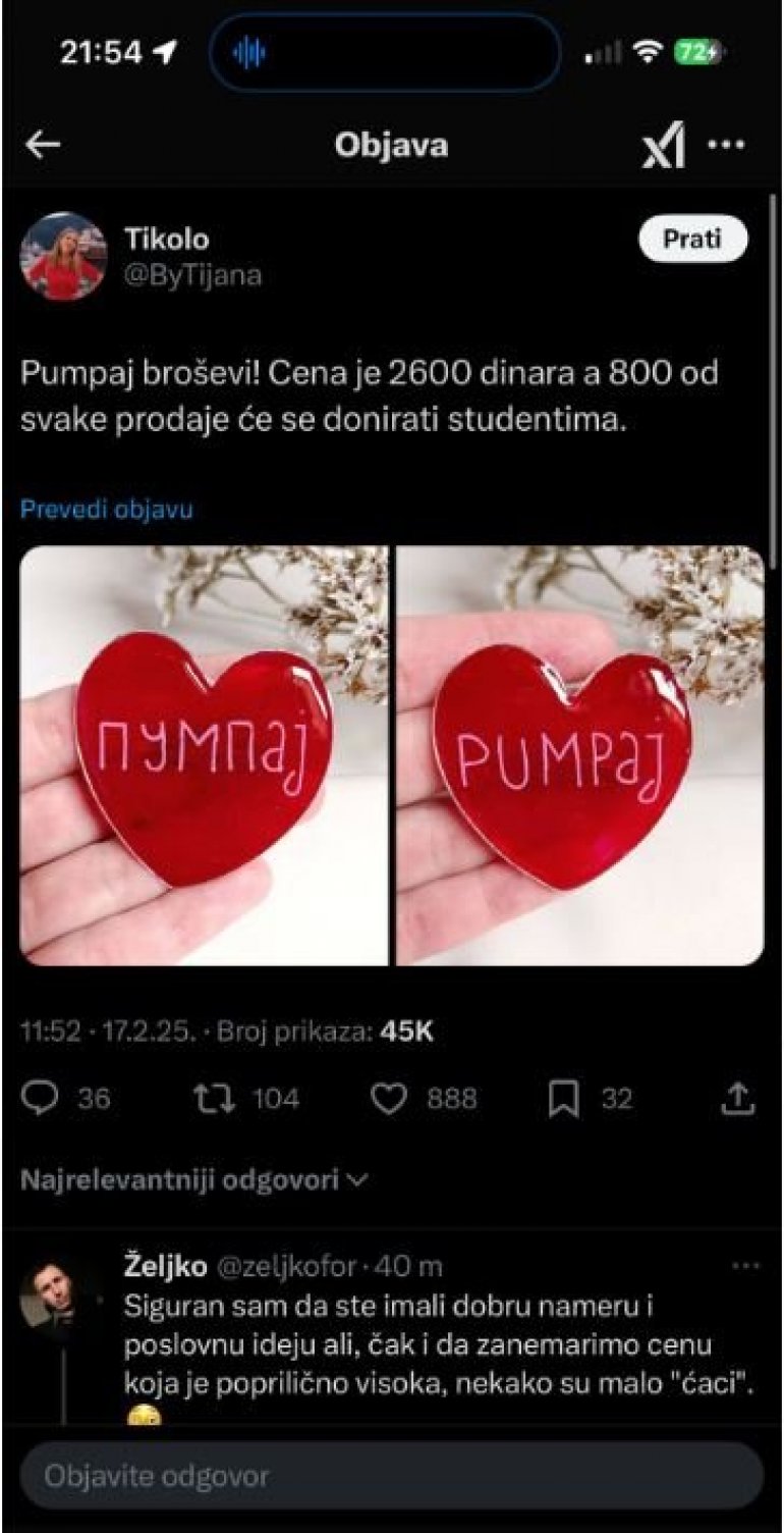 - Pumpaj broševi! Cena je 2600 dinara, a 800 od svake prodaje će se donirati studentima - stoji u objavi.