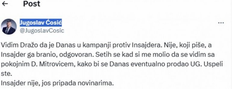 - Vidim Dražo da je Danas u kampanji protiv Insajdera. Nije, koji piše, a Insajder ga branio, odgovoran. Setih se kad si me molio da se vidim sa pokojnim D. Mitrovićem, kako bi se Danas eventualno prodao UG. Uspeli ste. Insajder nije, još pripada novinarima - napiso je Ćosić na društvenoj mreži Iks.