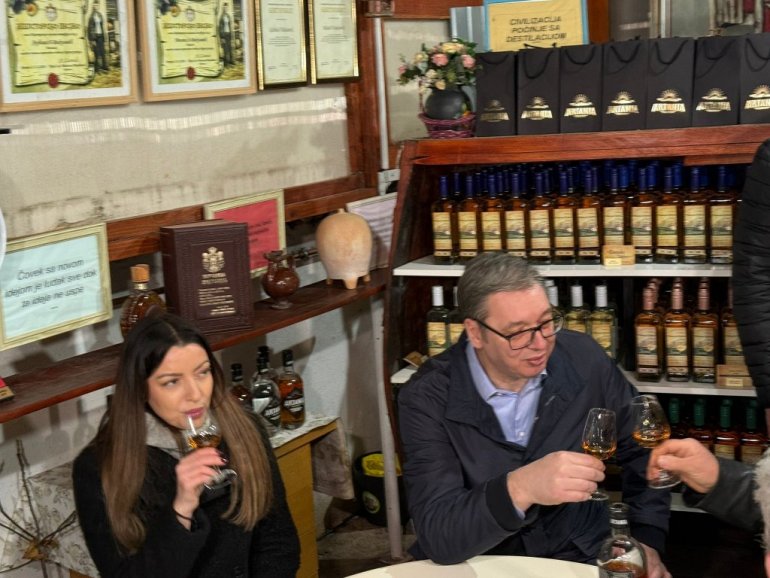 Predsednik je degustirao jedno od pića od šljive koje proizvodi ova porodica i nazdravio sa domaćinom.