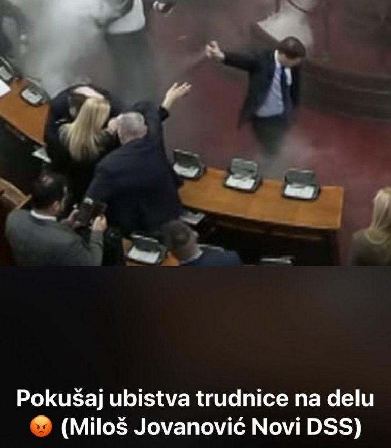 MILOŠ Jovanović iz Nova DSS, poslanik opozicije, isprskao je suzavcem trudnu poslanicu Sonju Ilić iz Gračanice koja se nalazi u osmom mesecu trudnoće.