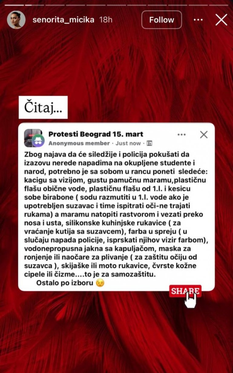 - Zbog najave da će siledžije i policija pokušati da izazovu nerede napadima na okupljene studente i narod, potrebno je sa sobom u rancu poneti sledeće: kacigu sa vizirom, gustu pamučnu maramu, plastičnu flašu obične vode, plastičnu flašu od 1.l i kesicu sode bikarbone (sodu razmutitiu 1. l. vode ako je upotrebljen suzavac i time ispirati oči- ne trljati rukama) a naramu natopiti rastvorom i vezati preko nosa i usta, silikonske kuhinjske rukavice (za vraćanje kutija sa suzavcem), farba u spreju (u slučaju napada policije, isprskati njihov vizir farbom), vodonepropusn ajakna sa kapuljačom, maska za ronjenje ili naočare za plivanje (za zaštitu očiju od suzavca), skijaške ii moto rukavice, čvrste kožne cipele ili čizme... to je za samozaštitu. Ostalo po izboru- napisao je anonimni član u grupi na Fejsbuku ''Protesti Beograd 15. mart''.
