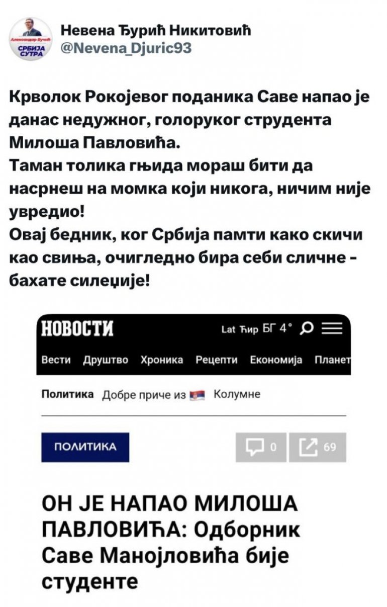 - Krvolok Rokojevog podanika Save napao je danas nedužnog, golorukog strudenta Miloša Pavlovića. Taman tolika gnjida moraš biti da nasrneš na momka koji nikoga, ničim nije uvredio! Ovaj bednik, kog Srbija pamti kako skiči kao svinja, očigledno bira sebi slične - bahate siledžije!