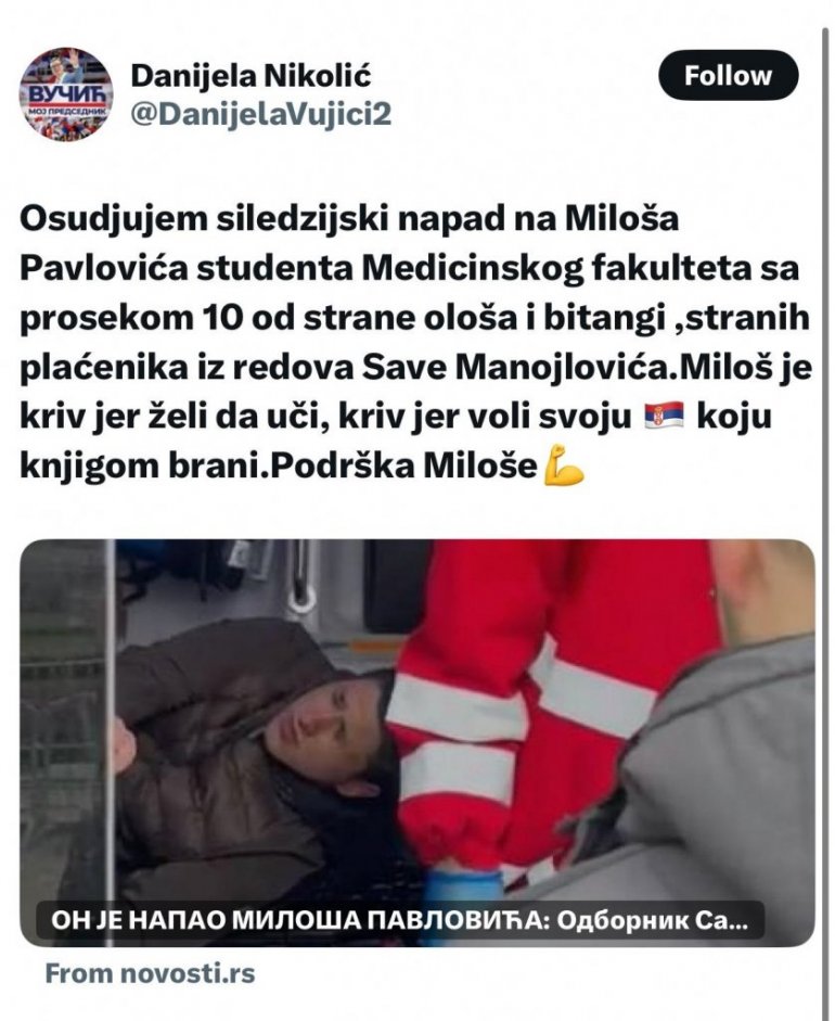 - Osuđujem siledžijski napad na Miloša Pavlovića studenta Medicinskog fakulteta sa prosekom 10 od strane ološa i bitangi ,stranih plaćenika iz redova Save Manojlovića. Miloš je kriv jer želi da uči, kriv jer voli svoju 🇷🇸 koju knjigom brani.Podrška Miloše💪