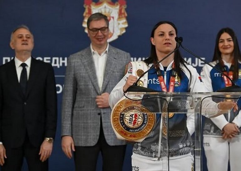 - Hvala vam na svemu što ste učinili u Nišu, nas ponosnim, naciju srećnom. Ono što smo mogli da gledamo bilo je čudesno, neverovatna posvećenost, hrabrost, borbenost. Ginule ste za našu trobojku. Kada smo vas ispratili za Niš navijali smo za vaš uspeh, potajno se nadajući medaljama. Hvala, Anđela, za prvo svetsko zlato, hvala za težak životni put kroz koji ste prošli i opet bili spremni da se borite i uradite sve za svoju zemlju. Naše bokserke ispisale su nove stranice bogate istorije srpskog sporta. Ostvarile su rezultat kakav nikada do sada Srbija nije imala, pet bronzanih i jednu zlatnu medalju. Hvala vam za to što ste nas učinile ponosnima. Hvala vam za to što ste nas učinili radosnima. Hvala vam što ste nam pokazale kako se bori, ne samo u ringu, nego i u životu. Sutra stiže novac za vas, 30.000 za zlatnu, pet puta po 20.000 za bronzanu medalju - rekao je predsednik.