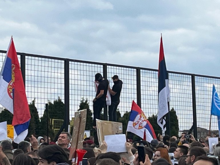 Maskirani studenti blokaderi popeli su se na ogradu kod Informera i kače transparente.
