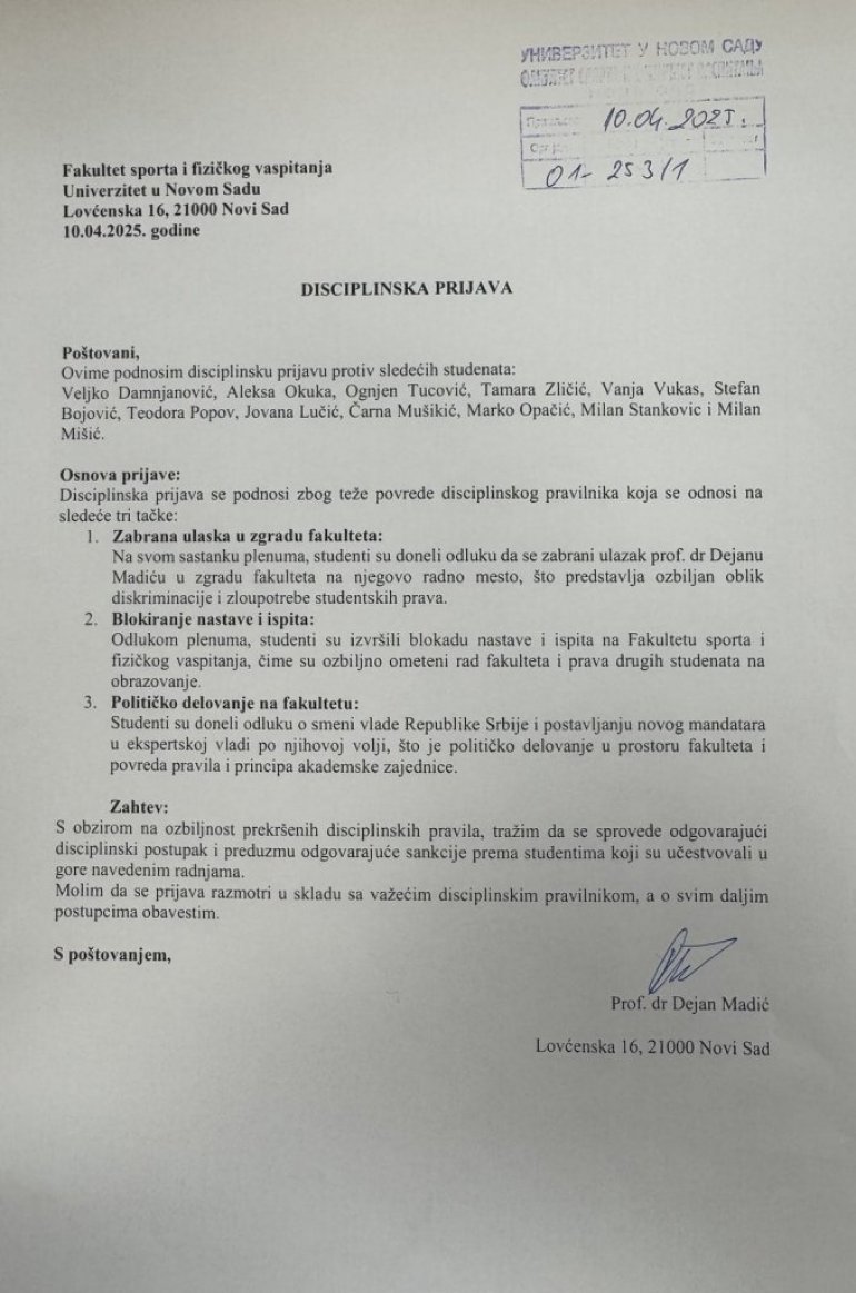 U prijavi koju je potpisao profesor dr Dejan Madić, traži se da im se oduzem status studenta na osnovu težih disciplinskih prekršaja. Prijavom je obuhvaćeno 12 studenata.