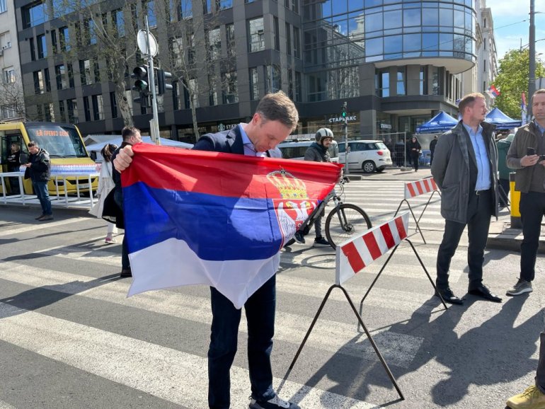 Prilikom susreta sa našom ekipom ministar je razvio srpsku zastavu.