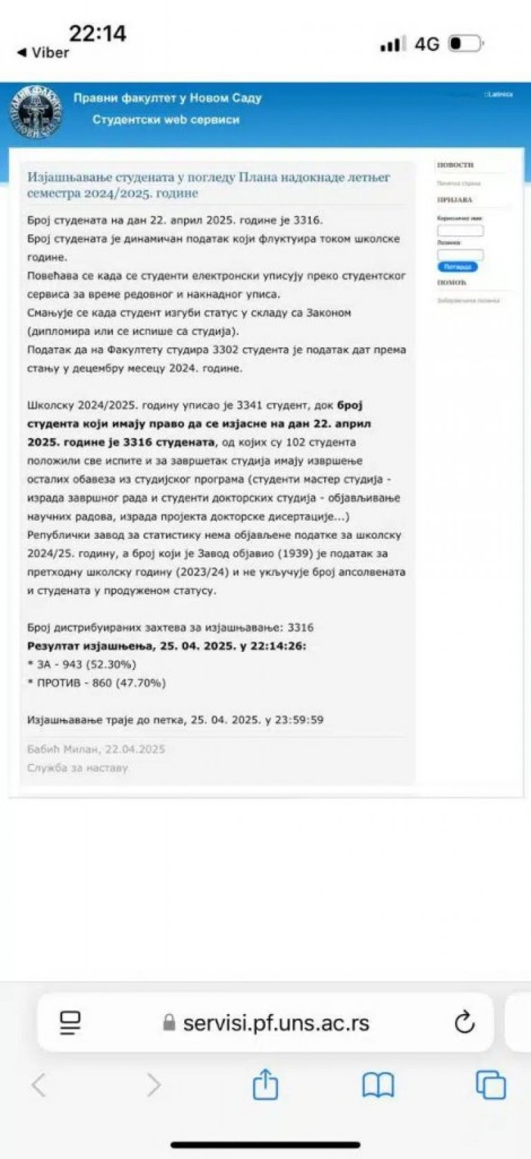 Izjašnjavanje je trebalo da traje do petka, 25.4. u ponoć, međutim, u 22 časa i 14 minuta se dešava tehnička zloupotreba servera i kompromitacija ličnih podataka studenata.