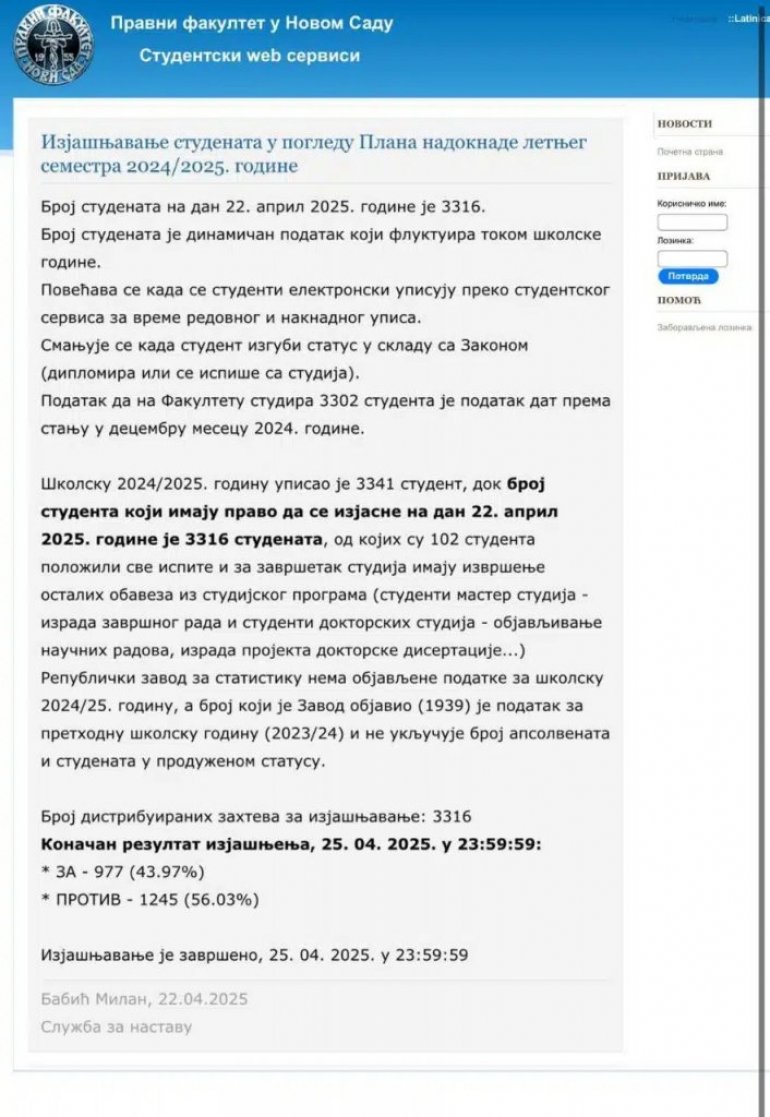 Uprava Pravnog fakulteta u Novom Sadu je u želji da obezbedi ustavom zagarantovano pravo na obrazovanje donela odluku o nastavku rada i organizovala izjašnjavanje studenata u pogledu Plana nadoknade letnjeg semestra 2024/2025. godine.