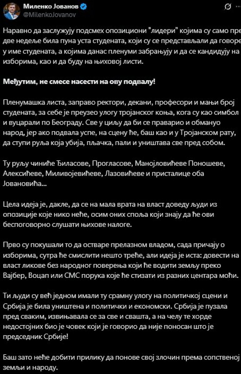 - Naravno da zaslužuju podsmeh opozicioni "lideri" kojima su samo pre dve nedelje bila puna usta studenata, koji su se predstavljali da govore u ime studenata, a kojima danas plenumi zabranjuju i da se kandiduju na izborima, kao i da budu na njihovoj listi. Međutim, ne smese nasesti na ovu podvalu! Plenumaška lista, zapravo rektori, dekani, profesori i manji broj studenata, za sebe je preuzeo ulogu trojanskog konja, koga su kao simbol i vucarali po Beogradu. Sve u cilju da bi se pravario i obmanuo narod, jer ako podvala uspe, na scenu će, baš kao i u Trojanskom ratu, da stupi rulja koja ubija, pljačka, pali i uništava sve pred sobom. Tu rulju činiće Đilasove, Proglasove, Manojlovićeve Ponoševe, Aleksićeve, Milivojevićeve, Lazovićeve i pristalice oba Jovanovića... Cela ideja je, dakle, da se na mala vrata na vlast dovedu ljudi iz opozicije koje niko neće, osim onih spolja koji znaju da će ovi bespogovorno slušati njihove naloge. Prvo su pokušali to da ostvare prelaznom vladom, sada pričaju o izborima, sutra će smisliti nešto treće, ali ideja je ista: dovesti na vlast likove bez narodnog poverenja koji će voditi zemlju preko Vajber, Vocap ili SMS poruka koje će stizati iz raznih centara moći. Ti ljudi su već jednom imali tu sramnu ulogu na političkoj sceni i Srbija je bila uništena i politički i ekonomski. Srbija je puzala pred svakim, izvinjavala se za sve i svašta, a na čelu te horde nedostojnih bio je čovek koji je govorio da nije ponosan što je predsednik Srbije! Baš zato neće dobiti priliku da ponove svoj zločin prema sopstvenoj zemlji i narodu - navodi se u objavi na društvenoj mreži Iks.