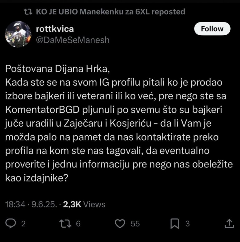 - Poštovana Dijana Hrka, kada ste na svom IG profilu pitali ko je prodao izbore bajkeri ili veterani ili ko već, pre nego ste sa KomentatorBGD pljunuli po svemu što su bajkeri juče uradili u Zaječaru i Kosjeriću - da li Vam je možda palo na pamet da nas kontaktirate preko profila na kom ste nas tagovali, da eventualno proverite i jednu informaciju pre nego nas obeležite kao izdajnike? - navodi se u objavi na mreži Iks.