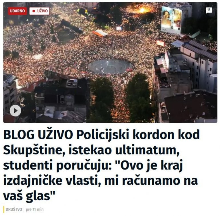 Oni u svojoj glavnoj vesti poručuju da je policijski kordon ispred skupštine, da je istekao ultimatum i prenose poruku blokadera "„Ovo je kraj izdajničke vlasti, mi računamo na vaš glas.“