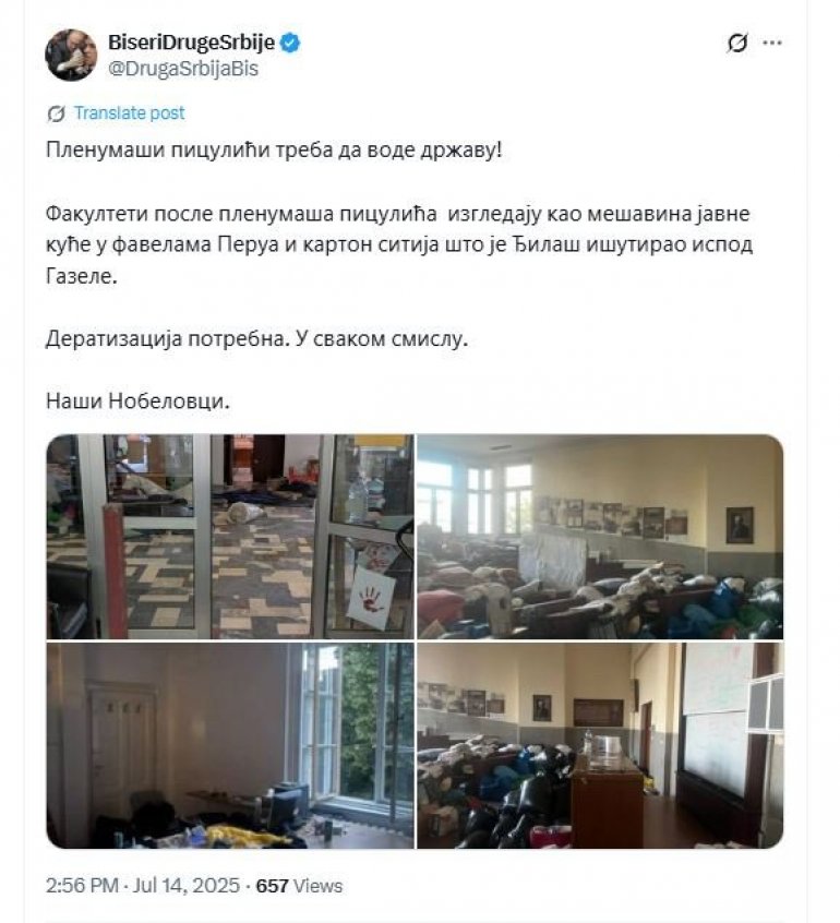 Deratizacija potrebna. U svakom smislu. Naši Nobelovci", napisao je jedan od korisnika društvene mreže Iks, uz fotografije zabeležene na Pravnom fakultetu.