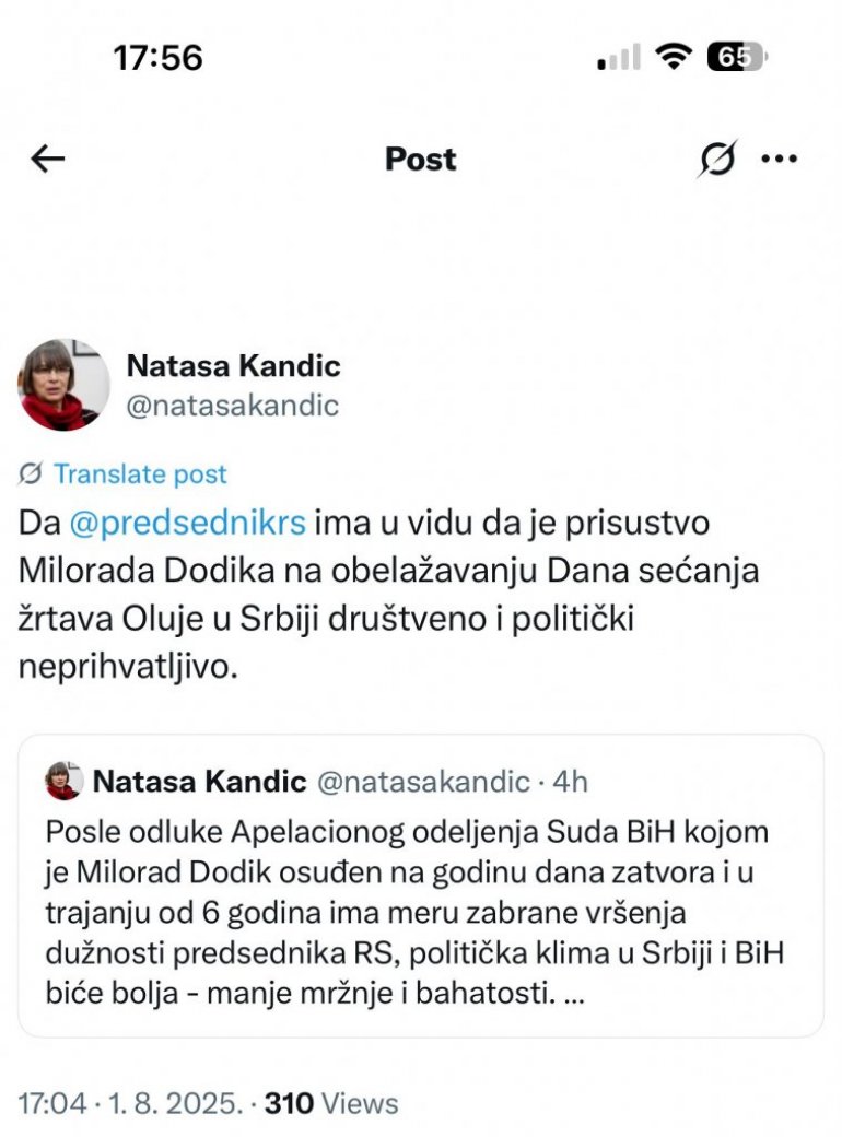 - Da Vučić ima u vidu da je prisustvo Milorada Dodika na obelažavanju Dana sećanja žrtava Oluje u Srbiji društveno i politički neprihvatljivo. - sramno je poručila Kandić.