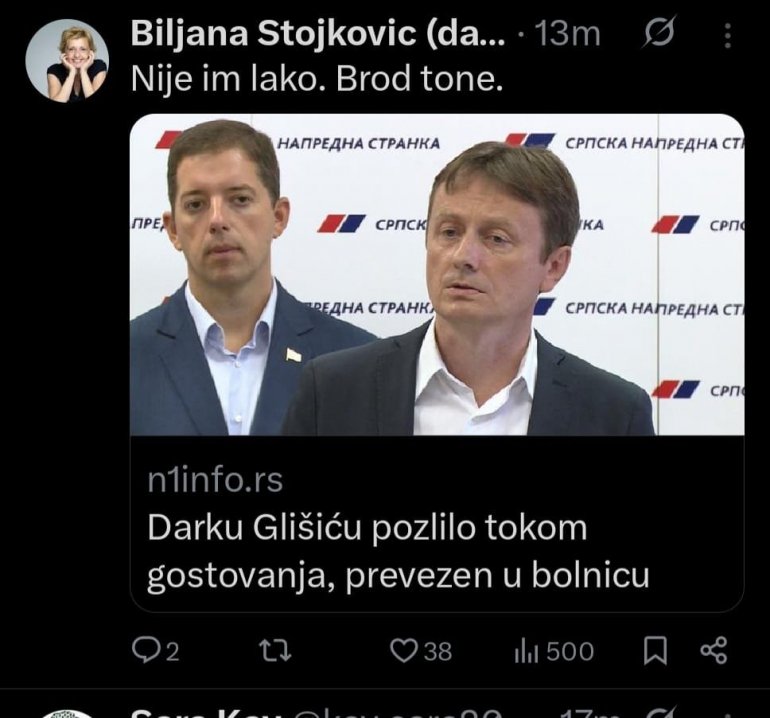 Ovog puta ona likuje nad tim što je ministar za javna ulaganja Darko Glišić doživeo težak moždani udar.